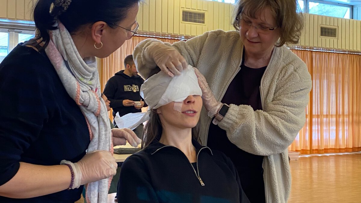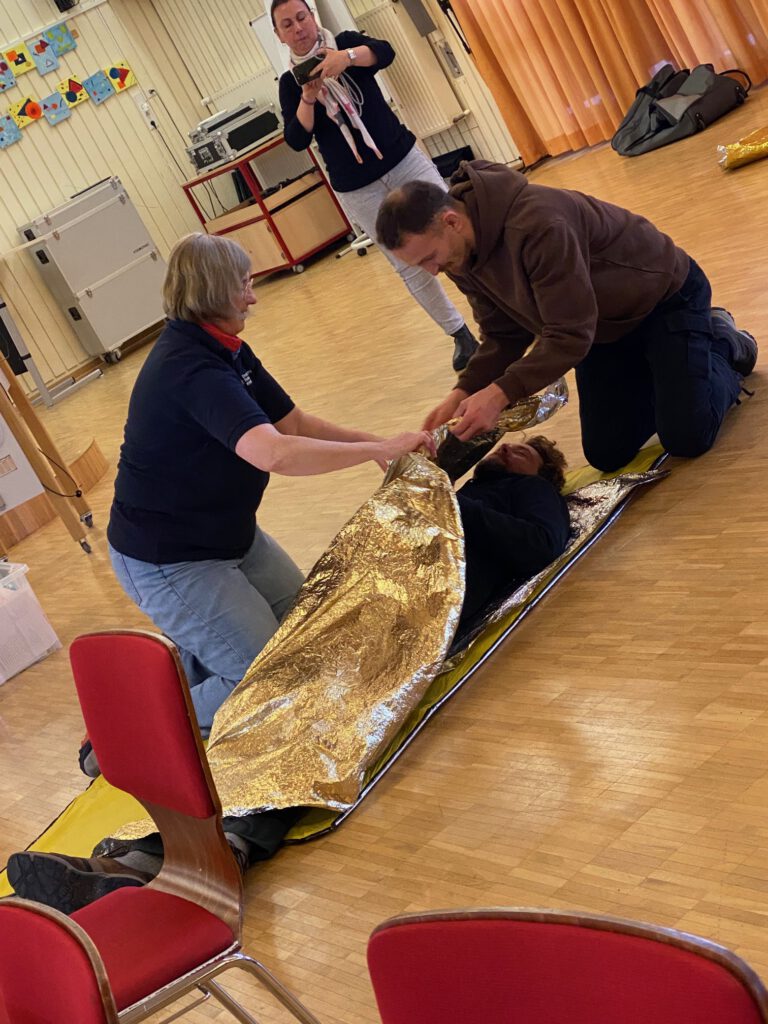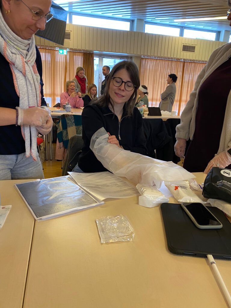 Unter der sehr kompetenten Leitung der DRK-Mitarbeiterin Frau Chudobba lernten die Kolleg*iinen unterschiedliche Maßnahmen kennen. Von diversen Wundverbänden bis hin zum lebensrettenden Prüfen – Rufen – Pressen an dafür vorgesehene Puppen konnte die Herzdruckmassage angewendet werden.